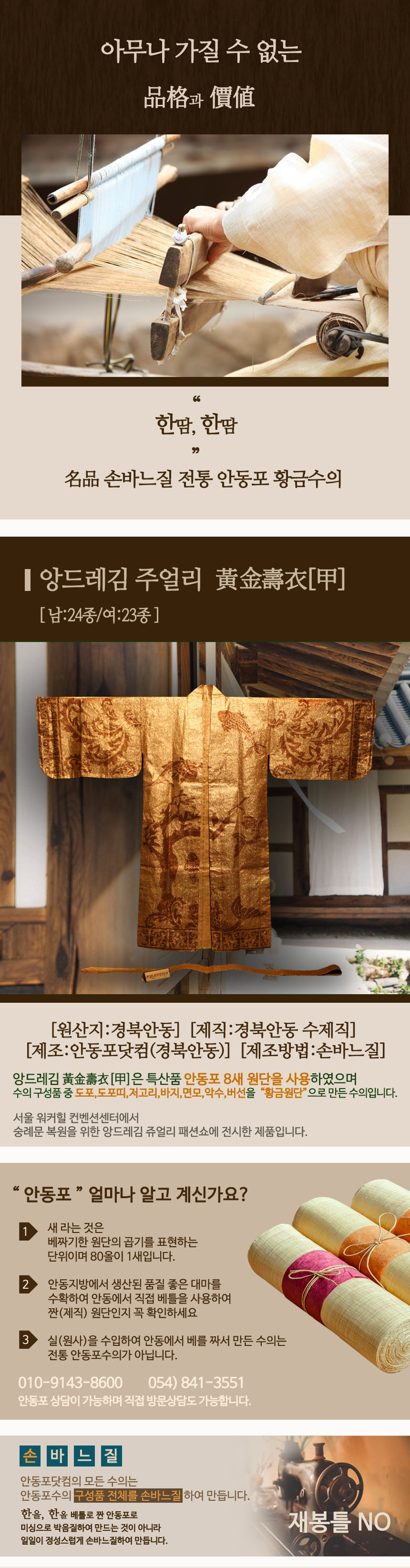 황금원단사용:도포(원삼), 도포띠(원삼띠), 저고리, 바지(치마), 면모, 악수, 버선을